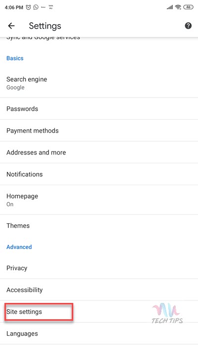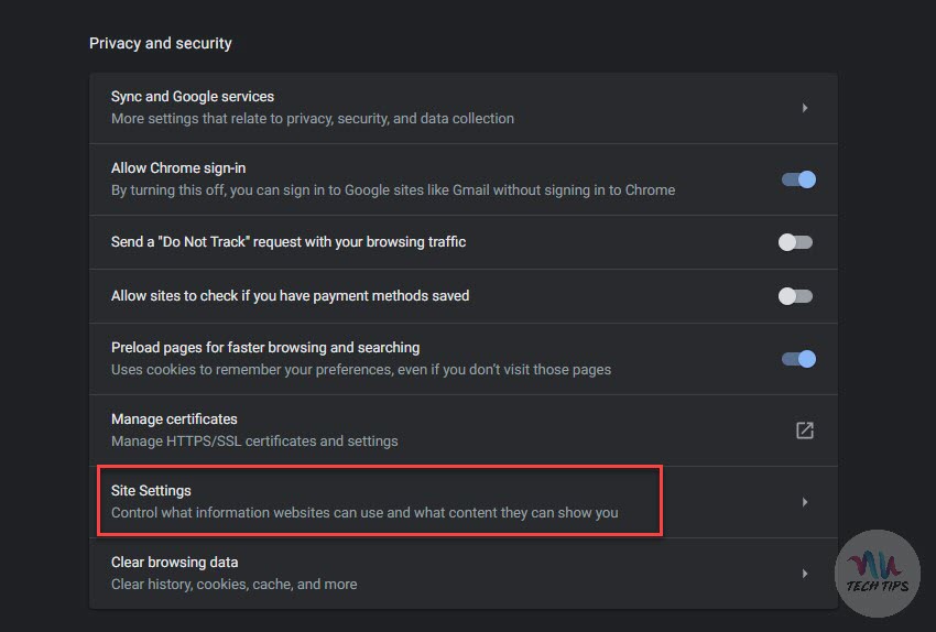 Step 2: Under Settings, go to Privacy and Security (available in Advanced) and then to Site Settings Page.