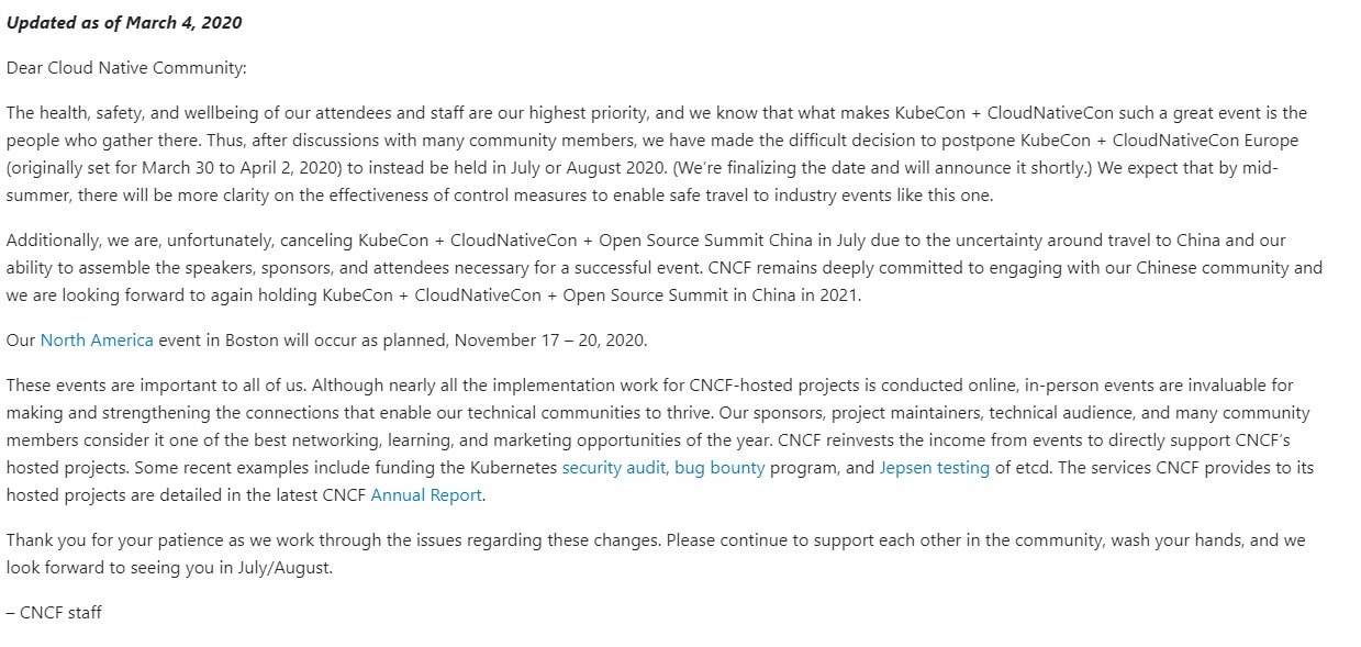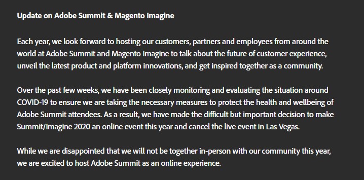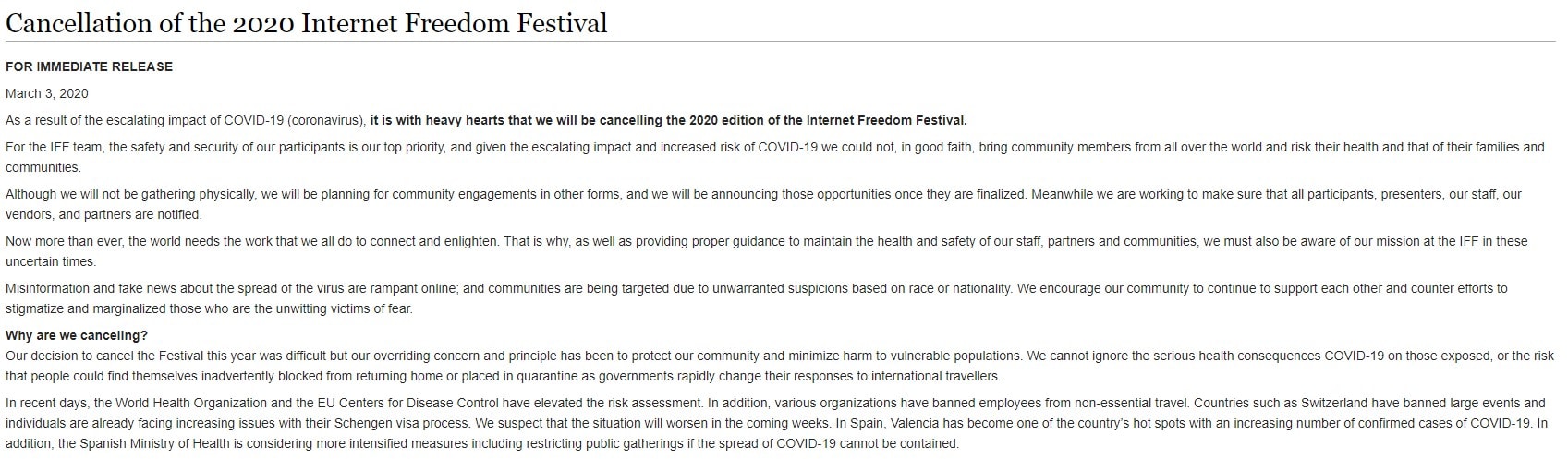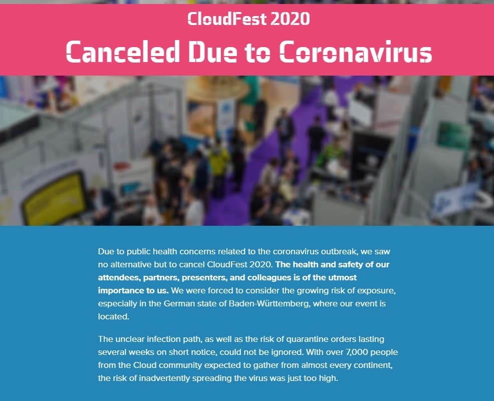 Here are some of the Major Events Cancelled/postponed or changed to online events due to Coronavirus outbreak which includes MWC 2020, Internet Freedom festival 2020, Google IO 2020, Adobe Summit, Facebook Conference and more on.